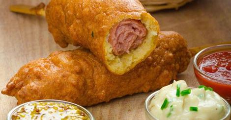 Dip each skewered hot dog completely in the batter, then carefully lower it into the hot oil.