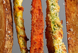 Arrange an oven rack in the lower third of the oven and a second one in the center. Line 2 rimmed baking sheets with parchment paper. Cut zucchini into thick French-fry-size sticks, about 3 inches long.