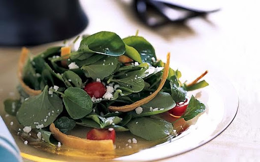 Toss watercress with dressing in a large bowl and divide among 8 plates. Divide tomatoes and tortilla strips among salads, tucking strips into greens decoratively, and sprinkle salads with cheese.