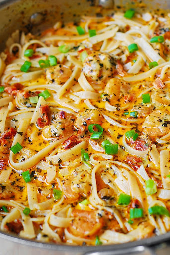Garlic Shrimp and Sun-Dried Tomatoes with Pasta in Spicy Creamy Sauce