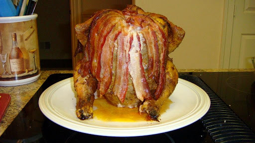 Mix dry ingredients in small bowl. Rub 1/2 of the ingredients on inside cavity of chicken. Gently peel skin away from chicken and rub mixture into meat of chicken. Open beer can pour out about 1/2 cup. Drop the garlic cloves into the beer can. Place chicken, open end down, over the beer can to insert the beer into the cavity. Place chicken, standing up, in large saute pan. Place 1/3 of the bacon in the top cavity of the chicken and drape the remaining 2/3 of the bacon down the outside of the chicken. Pierce the bacon to the chicken with toothpicks.