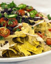 Remove from heat and season with salt and pepper; serve immediately with nachos.