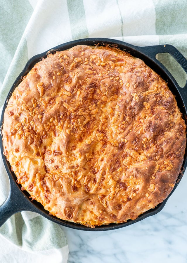 I used a 10" cast iron skillet to make this recipe. If you use a smaller size, the loaf will end up taller. If you use a bigger size, the loaf will end up thinner.