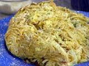 In a large saute pan, over medium heat, cook the bacon until crispy, about 6 minutes. Remove the bacon and drain on paper towels. Pour off all of the oil except for 3 tablespoons. Add the garlic. Season with black pepper. Saute for 30 seconds. Add the crispy bacon and the pasta. Saute for 1 minute. Season the eggs with salt. Remove the pan from the heat and add the eggs, whisking quickly until the eggs thicken, but do not scramble. Add the cheese and re-season with salt and pepper. Mound into serving bowls and garnish with parsley.