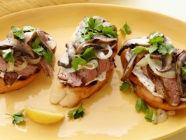 Assemble the open-faced sandwiches: On each slice of bread, spread 1 tablespoon of the sour cream sauce. Top with the steak, mushrooms, onions, another tablespoon of sauce and parsley. Finish with a squeeze of lemon juice and some salt and pepper.