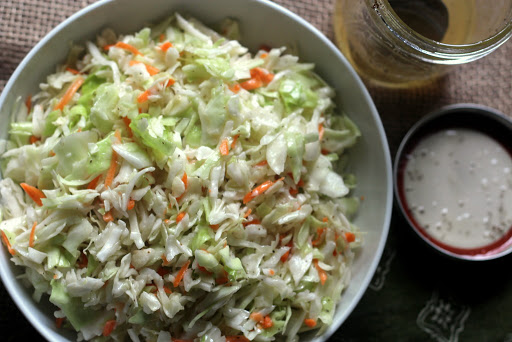 Add cabbage to medium sized bowl. Pour dressing over the top and stir well. Cover, and chill in refridgerator for at least 15 minutes before serving.