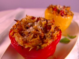 Place the peppers in the baking dish with the warm chicken broth. Spoon the orzo mixture into the peppers. Cover the dish with foil and bake for 45 minutes. Remove the foil, sprinkle the top of each pepper with cheese and continue baking until the cheese is golden, about 15 minutes. Remove from the oven, carefully transfer the orzo stuffed pepper to a serving plate.
