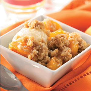 2Transfer the mixture to an 8-by-8-inch glass or ceramic baking dish and arrange it in an even layer. Sprinkle the reserved topping evenly over the peaches.