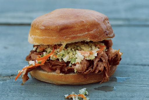 Serve pork, cracklings, and coleslaw together on buns. Serve reserved vinegar sauce on the side.