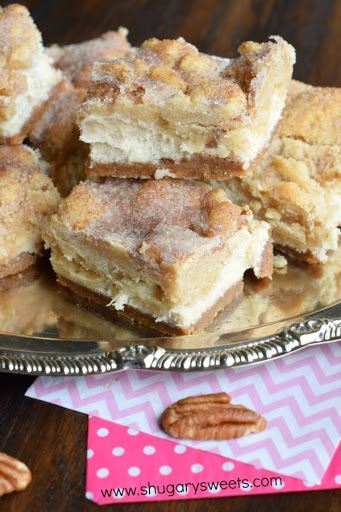 For the cookie dough, beat butter with sugar for 2 minutes. Add egg and vanilla and beat thoroughly. Add in baking powder, salt, flour and cinnamon and beat until fully combined. Fold in chopped pecans. Scoop dough by large spoonfuls onto the top of the cheesecake layer. Try to use your fingertips to spread gently until cheesecake layer if fully covered.