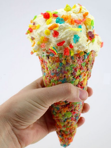 Spoon some of the Rice Krispie or Fruity Pebbles between two pieces of wax paper while they were still warm, flatten them into a sheet with a rolling pin and then wrap them around a cone