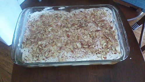 6: Chill overnight. Before serving, cover with whipped cream and sprinkle with slivered almonds