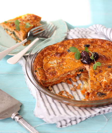 3.Grease 2 dishes and arrange the sliced sweet potatoes across the bottom, overlapping slightly, for your crust. (see a photo of this here)