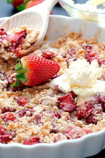 Add to your bowl the lemon juice, nutmeg, and white sugar. Toss the fruit lightly in this mixture and then add cornstarch. Toss again, making sure to cover all of the fruit, then add the strawberries to your baking dish.