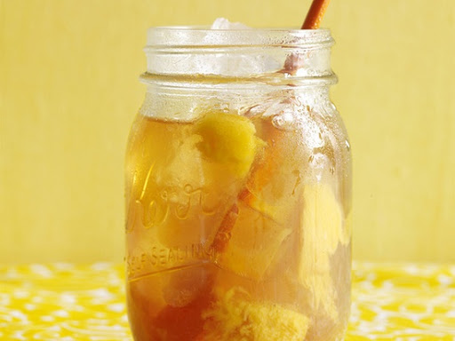 Mash 6 canned peach halves with 1 1/2 cups of the juice, 1/3 cup sugar and 1 tablespoon grated ginger in a pitcher. Add ice and 6 cups cold English breakfast tea.