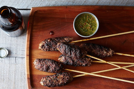 In a medium bowl, mix meat with other ingredients, portion into six logs. Wrap the meat mixture around skewers.