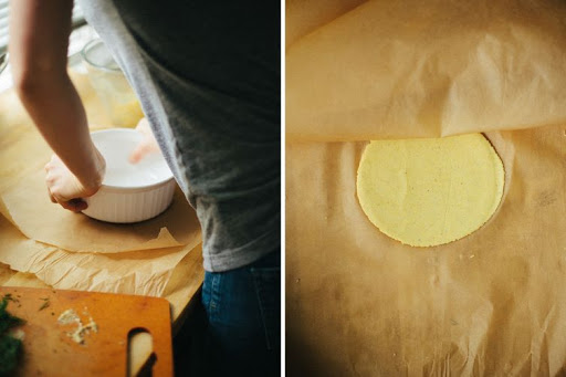 Lay out a few (2 to 3) sheets of parchment paper and fetch that nifty casserole dish or pyrex to help you press out the dough.