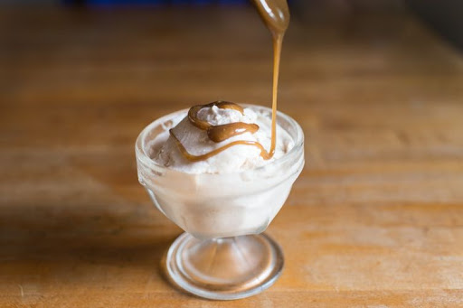 Once the ice cream has chilled, serve it with the caramel sauce.