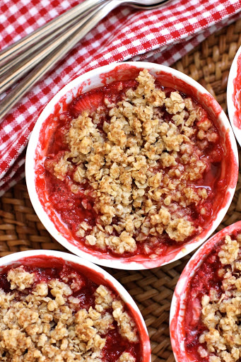 Fill each ramekin to the top with the strawberry mixture and then gently spoon the the oat crisp topping over the strawberries.
