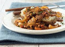 4. To serve, place 1/2 potato on each serving plate. Top each with 1 1/2 cups beef mixture; sprinkle each with 1 tablespoon parsley.
