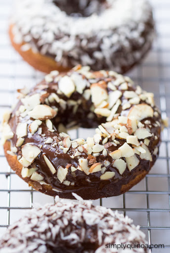 While cooling, prepare the glaze by melting the chocolate chips with the coconut oil. Whisk in the cocoa powder. Dunk the donuts into the glaze, letting the extra drip off and then roll them into your desired toppings.