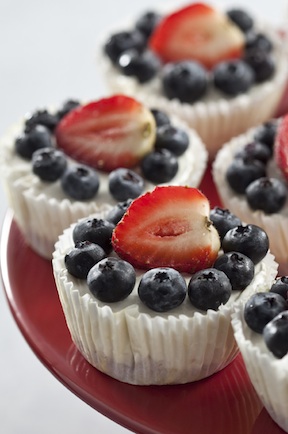 4. Spoon the cheesecake filling into the crusts and smooth the tops. Place a strawberry half in the center of each cheesecake and topping of choice on top. Place cheesecakes in the refrigerator and chill until set, at least 2 hours.