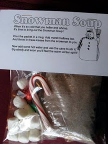 To make Snowman Soup, place 1/3 Cup mix into sealed bag (or an envelope of store bought mix) and package with a small candy cane, ten miniature marshmallows, two chocolate kisses, and tag with instructions and poem.