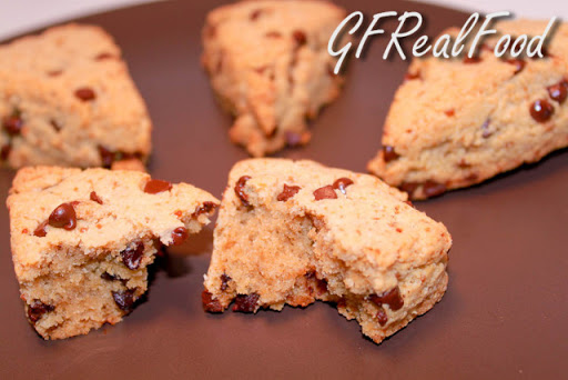 Preheat oven to 350. Line baking sheet with parchment paper. In medium bowl combine first 4 ingredients. Add melted coconut oil and lightly beaten egg. Mix well with a fork. Fold in chocolate chips. Transfer dough to parchment lined baking sheet and form a ball. Press ball down until it is about 1 1/2 thick or about 8 inches in diameter. Cut into 6wedges. Separate the slices evenly on the sheet. Bake for approximately 15 minutes or until the edges are starting to brown slightly and the centers are firm to touch. Let cool to room temperature and serve.