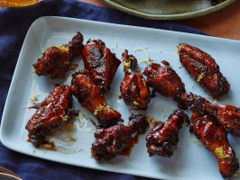 To serve, arrange the wings on a platter and garnish with lemon zest.