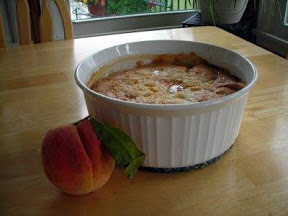 After butter is melted, take casserole out of oven and pour batter on top of melted butter. Pour peaches on top of batter. DO NOT STIR! Sprinkle a tablespoon of sugar over pie. Place in 350 oven and cook for 55 minutes or until golden.