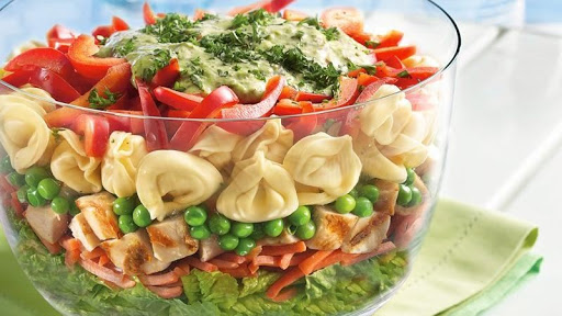 In 3- or 4-quart clear bowl, layer the lettuce, the carrots, chicken, peas, the tortellini, and bell pepper.