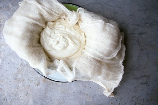 Fill a small strainer with several layers of cheesecloth (I use three) and put a small bowl under the strainer.