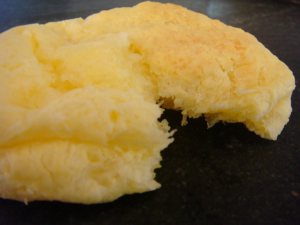 Preheat oven to 350. Line cookie sheet with foil and spray with nonstick cooking spray and set aside. In a large bowl mix the first 4 ingredients. Then add the egg yolks and cheese. Using your hands, mix it well. At first it will be like flour coated cheese. Then add half and half 1 TBSP at a time while continuing to mix with your hands. When the dough is well blended, uniform and able to stick together, roll into eight balls. Bake for 15 minutes until very lightly golden. Don’t brown them. Browning will change the flavor. Let cool for as long as you can stand to and eat warm.