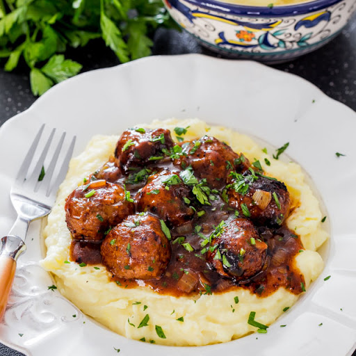 SALISBURY STEAK MEATBALLS WITH GRAVY AND MASHED POTATOES