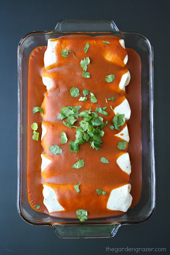 I don't want to get all dramatic... but you guys? These have been life changing. Two things make them our favorite vegan enchiladas yet. First is the combo of black beans and garbanzo beans. Chickpeas don't often appear in enchiladas but we totally dig the unexpected addition. (If you're not a fan of garbanzos, sub in quinoa!) Second is when the natural juices from the tomato is mixed with nutritional yeast in the pan, it makes a rock-star "sauce" that really brings the filling together. Crazy good. Each enchilada comes out to a whopping 20 grams of protein (even more if you use sprouted grain tortillas). If you're feeling extra feisty, you can even throw in some spinach at the end! The ingredient list is much longer than most of my recipes, but it's not nearly as complicated as it looks. I wanted to include my recipe for homemade enchilada sauce if you really want to take them to the next level. I mean, c'mon...