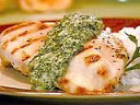 Meanwhile, in a food processor, combine spinach, mayonnaise, vermouth, horseradish, lemon juice, and parsley. Process until blended and smooth. Season, to taste, with salt and black pepper. Spoon sauce over half of the chicken. Reserve remaining chicken for another recipe.