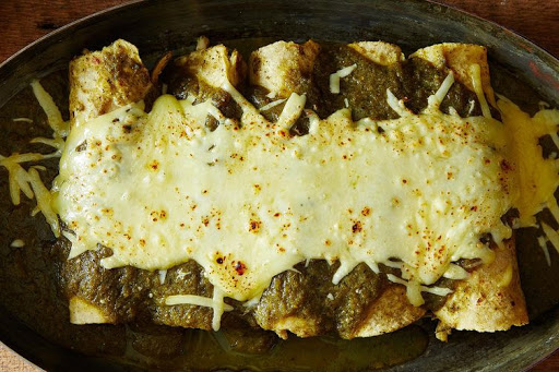 Make the enchiladas one at a time: Dip a tortilla in the salsa until just softened. Lay out on a plate, put some chicken across the middle of the tortilla and roll it up. Place in a baking dish or directly on an oven-safe dinner plate. When all of the tortillas have been made, ladle the salsa generously over them, sprinkle the cheese over the top, and place the baking dish or plates into the oven. Bake for 15 minutes, until chicken filling is heated through and cheese has melted. Serve with generous dollop of sour cream on top, and some chopped fresh cilantro.
