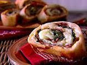 On a lightly floured work surface, roll out the pizza dough to a 12 to 14-inch diameter circle, about 1/4-inch thick. Sprinkle 1/2 of the mozzarella over the dough. Arrange the prosciutto over the cheese in a single layer. Sprinkle with the spinach. Top with the remaining cheese. Take 1 end of the circle and roll the dough up into a thin cylinder, gently folding in the ends. Brush the dough with the olive oil and season with the salt. Place the dough, seam side down, on a parchment lined baking sheet and bake for 25 minutes until the top is golden brown. Allow the pizza to cool for 10 minutes. Using a serrated knife, cut the pizza into 3/4-inch pieces and serve.