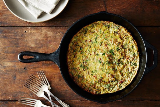Remove the skillet from the oven and pour in the egg mixture. It should sizzle. Return the skillet to the oven and bake until puffed and lightly colored, about 30 minutes. Serve hot, warm, or at room temperature.