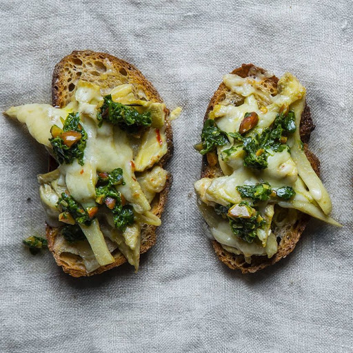 4. Rub the garlic clove over each warm toast 2 to 3 times. Spoon the artichoke mixture over the toasts and top with the Gruyère. Bake on the center rack of the oven until the cheese melts, 4 to 5 minutes. Remove the toasts from the oven and spoon the pesto over the top. Using a microplane, zest the lemon over each toast and serve.