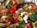 Arrange the vegetables in a single layer on a tray or work surface. Lightly spray both sides with olive oil cooking spray. Preheat a grill or grill pan over a medium-high heat. Grill the vegetables in batches until both sides are nicely charred and the vegetables are just tender, about 10 minutes for the pepper, about 8 minutes for the eggplant and onion, and about 6 minutes for the zucchini. When the vegetables are cool enough to handle, cut into 1/2-inch pieces and transfer to a large bowl.