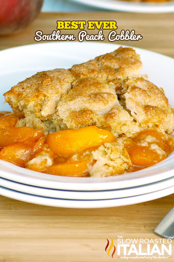 Fresh sweet peaches baked in a spiced sugar mixture and topped with the most amazing cobbler topping. Sprinkled with sugar for a caramelized topping it is heaven on a plate.