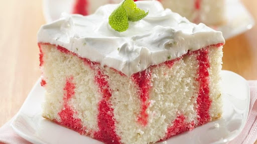 Meanwhile, stir gelatin into boiling water, stirring for 2 minutes to completely dissolve gelatin. Poke cake every inch with tines of meat fork or table knife. Pour cherry mixture slowly over cake, allowing mixture to fill holes in cake. Cool completely, about 1 hour longer.