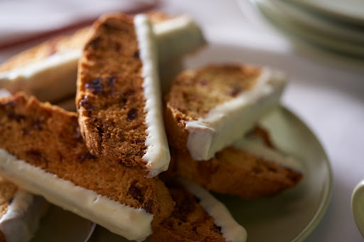 While the biscotti are cooling, melt the white chocolate in a double boiler. Once cool, dip the long, straight side of each biscotti into the white chocolate and place the cookies on a cooling rack, sliced side down. Keep a baking sheet underneath to collect the chocolate drippings. Let the chocolate cool completely before serving.