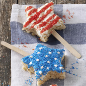 In a Dutch oven, heat marshmallows and butter until melted. Remove from the heat; stir in cereal and mix well. Press into a greased 15x10x1-inch baking pan. Cut with a 3-inch star-shaped cookie cutter. Insert a wooden popsicle stick into the side of each star; place on waxed paper.