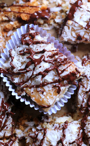 Remove from the heat and stir in the vanilla along with 2 cups of the coconut. Pour onto the cookie base and spread in an even layer. Sprinkle the remaining coconut over the top. Let cool to room temperature and then refrigerate for 1 hour.
