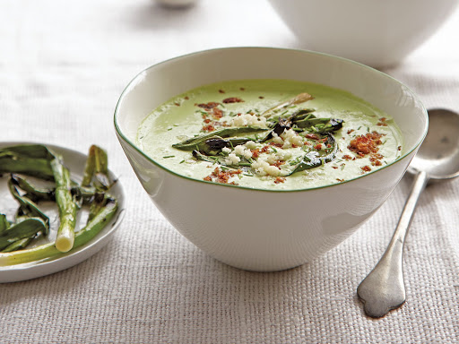 Spinach, Chive, and Yogurt Soup with Grilled Scallions