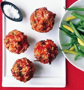 1. Heat oven to 350°. Soak bread and milk in a bowl for 10 minutes. Combine remaining loaf ingredients in another bowl; add bread and milk; mix well. Scoop 1/3 cup of mixture into each of 7 nonstick muffin tin cups. Bake 10 minutes.