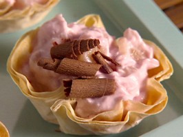 Meanwhile, combine the mascarpone, pineapple, and raspberry yogurt in a small bowl and stir to combine. Spoon the mascarpone mixture into the phyllo cups. Using a vegetable peeler, shave some chocolate onto the top of the mascarpone mixture and serve.