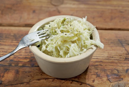 3. Pour the dressing over the onion and cabbage and stir. Refrigerate for about 2 hours.